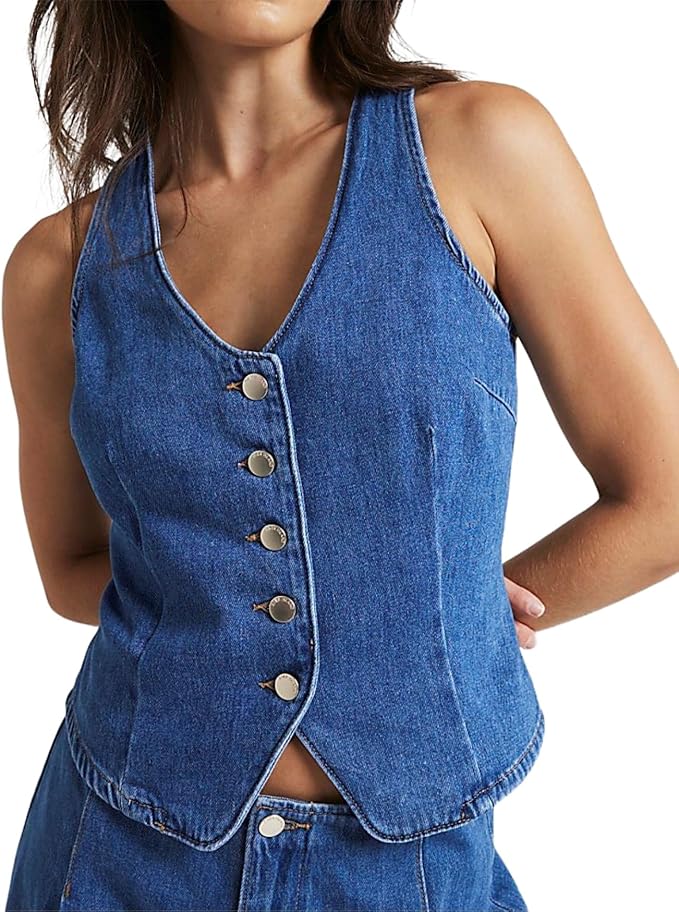 - Women’s denim vest features that V neck, sleeveless, button down,solid color, slim fit, casual.