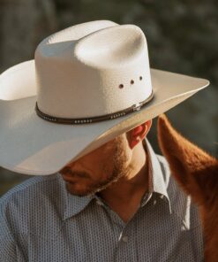 Handmade in the U.S.A., Made from quality straw, this hat is lightweight and breathable, perfect for keeping cool in warm weather. this hat features a classic cowboy design with a broad 4 1/4″ brim and a comfortable 4 1/8″ crown. The dri-lex interior sweatband ensures moisture-wicking comfort, making it ideal for long days outdoors. Adorned with a studded leather hat band and side vents, combines rugged charm with refined elegance.