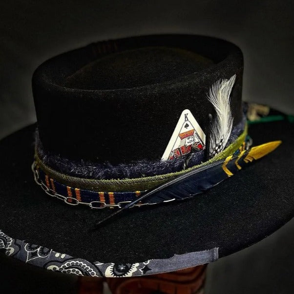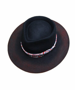 “Distressed Fedora with Red and White Patterned Band” is hand-distressed, hand-dyed, and hand-torched, ensuring no two share the same color or design. Each piece is uniquely imperfect, with subtle variations from product images.