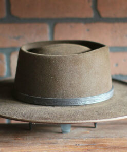 Eedrich weathered ‘Man With No Name’ Gambler hat in 100% wool felt felt and adorned with a tooled, genuine leather hatband and vintage grosgrain ribbon binding.