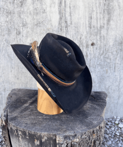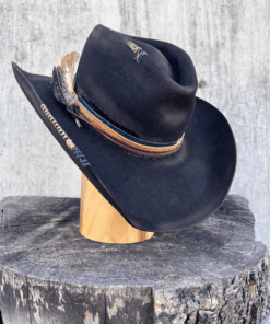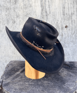 “Ebony Blue Vintage Felt Cowboy Hat” is hand-distressed, hand-dyed, and hand-torched, ensuring no two share the same color or design. Each piece is uniquely imperfect, with subtle variations from product images.