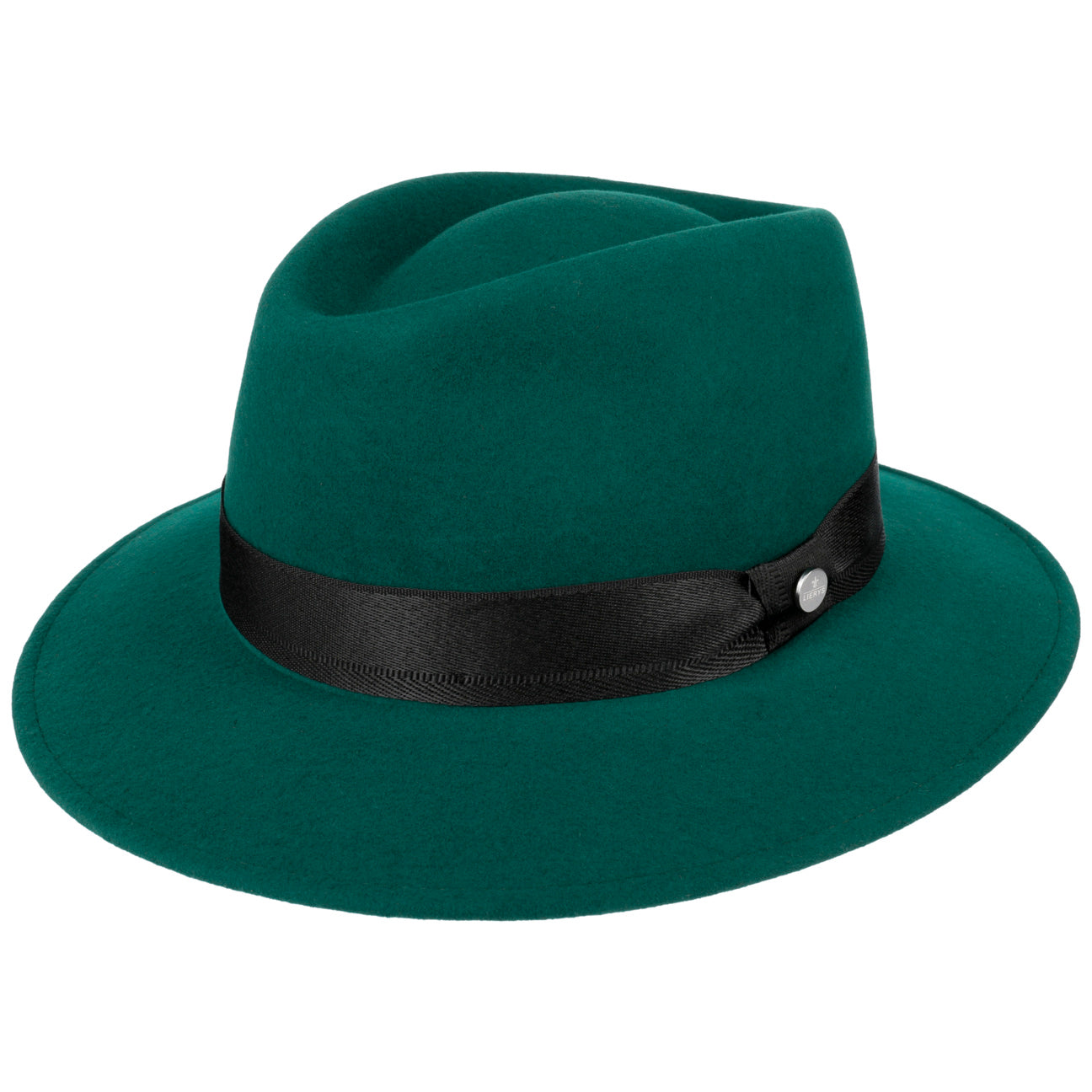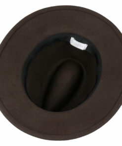 The typical shape of a traveller hat – with deep indentations and a wide brim – makes this handmade felt hat look timeless and elegant. The dynamically designed grosgrain ribbon, which is gallantly twisted on the side, is a particularly eye-catching feature. It attracts attention with its two overlapping patterns: a micro check and a contrast-coloured pattern made up of small and large ovals.