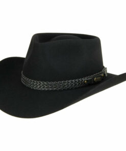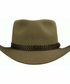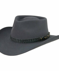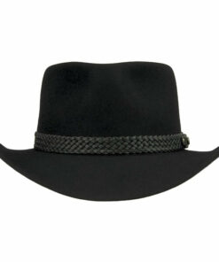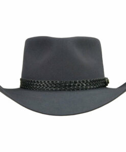 The Snowy River is a pre-creased stockman’s hat from Akubra, a classic Australian outback hat. It has a pinched telescope crown and a brim with rolled sides with front and back turned down. This enduring outback style may be worn over the eyes or well back on the head in typical Australian fashion. The crown is 4 inches high. The brim is 3″ inches wide, with a raw edge. The pure fur felt is Akubra’s Imperial Quality. The hat is fully lined and has a bonded leather ornamental band. Reeded roan leather sweatband. UPF rating 50+. Made in Australia.