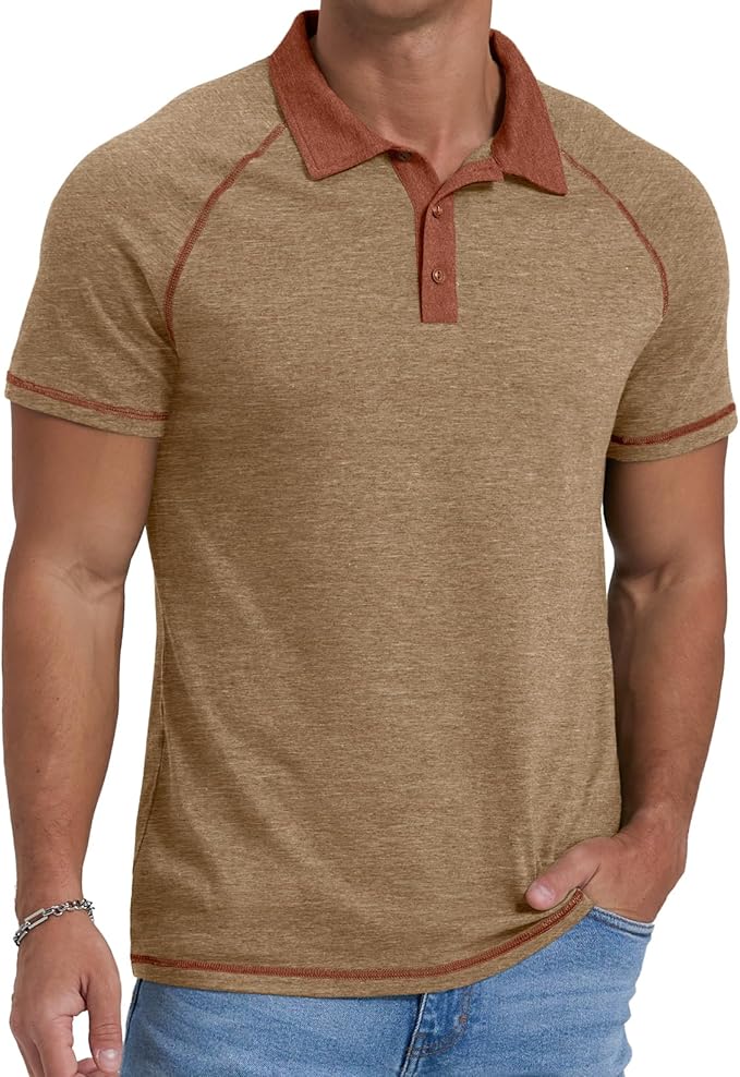 - Men’s raglan polo shirts features with polo collar, 3 button closure, subtle contrast stitching throughout, faux wood buttons, the contrasts will wake up denim and khakis.