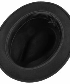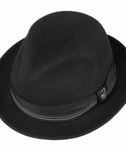 Supple wool felt gives this hat its pleasant feel and, together with a skin-friendly lining made of cotton, makes it comfortable to wear. The plain design of the felt hat with narrow brim is complemented by a subtly striped grosgrain ribbon trim with brand pin, which emphasises the hats neat charm. This trilby can be worn on everyday outings, but also makes a great club hat.