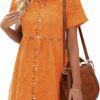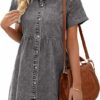 - Design: Lapel collar denim dress with sewn cuffs short sleeves. High waist line under bust and subtle high low hemline help this above knee dress add stylish aesthetic. Front button down jean dress with back tiered. Women denim dress for summer casual, babydoll dress for women short sleeve.